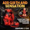 Become the wolf of your partner’s dreams with this Hell Hound sleeve and ball stretcher! It fits over your shaft, adding pressure to your rod, while also wrapping around your balls and stretching them! Made out of premium, phthalate-free, body-safe silicone, it is best used only with water-based lubricants only. Enhance your playtime and the sensations by giving yourself a rod that gets thicker by adding these two bulging, wolf-knots at the base! It stays in place due to the ball stretcher wrapped around your family jewels, and essentially tugs your balls every time your partner goes deep! Enjoy adding this to your kinky cosplay and fantasy roleplay while indulging with your partner! After use, wash it with warm water and mild soap, then rinse it off and spray it with a toy cleaner. Pat dry and store in a cool, dark place.Measurements:Overall length: 3.5 inches.Ball ring: 1.2 inches inner diameter.Cock ring: 1.1 inches inner diameter, 2.6 inches outer diameter (adds 1.6 inches in girth).Materials: SiliconeKey Features:Fantasy Sheath: This red and black sheath has canine knots that bulge at the base, and a strap that wraps around the balls.Ball Stretching: Give your balls a tug that stretches them, enhances sensation, and increases endurance!Adds Girth!: Add girth to that rod of yours and give your partner a thick shaft to ride!Premium Silicone: Made out of premium, phthalate-free, body-safe silicone.