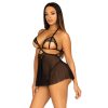 This daring two-piece open-cup babydoll lingerie set is the perfect way to spice things up and get some serious conversation going. The sheer mesh nightie features an open cup design with delicate eyelash lace detail, a strappy back, and a heart ring accent.The matching thong panties complete the look, while the sexy and seductive style is sure to get their attention. Be bold and show off your curves in this daring lingerie set and give them something to talk about.Package includes babydoll and matching pantyStretchy, breathable see-through lingerie fabricOpen-cup lingerie topStrappy wrap-around backWash by hand, do not bleach, drip dry, do not ironBabydoll 100% Polyester, Panty: 100% Nylon
