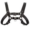 This handsome harness combines bonded leather and stainless-steel detail, to wrap around your chest and back, accentuating your curves and edges. The two O-rings, one on the front and the back, make it easy to attach various BDSM accessories and take your bondage play to the next level.Buckles on the sides of the torso and on each shoulder allow you to adjust this harness to the perfect fit. Wear it on bare skin and instantly capture admiring eyes as they showcase your strength. Wear it over your clothes and let people know what kind of fun you’re up for!