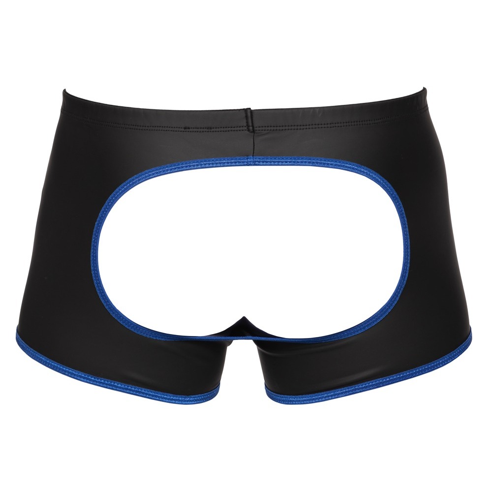 Trendy matte look pants with an open back.Showmaster holes for the penis and testicles.The pants feel very exciting.Stretchy and very comfortable.A provocative style at the front and back!Pants with an open back from Svenjoyment. They also have showmaster holes for the penis and testicles. Made out of trendy, black matte look material with contrasting, stitched cut-outs in a royal blue colour. There is also royal blue material around the legs. The tight-fitting but stretchy material is extremely comfortable. The provocative holes are not just an eye-catcher, but they also feel very exciting.94% polyester, 6% spandex, polyurethane coating.